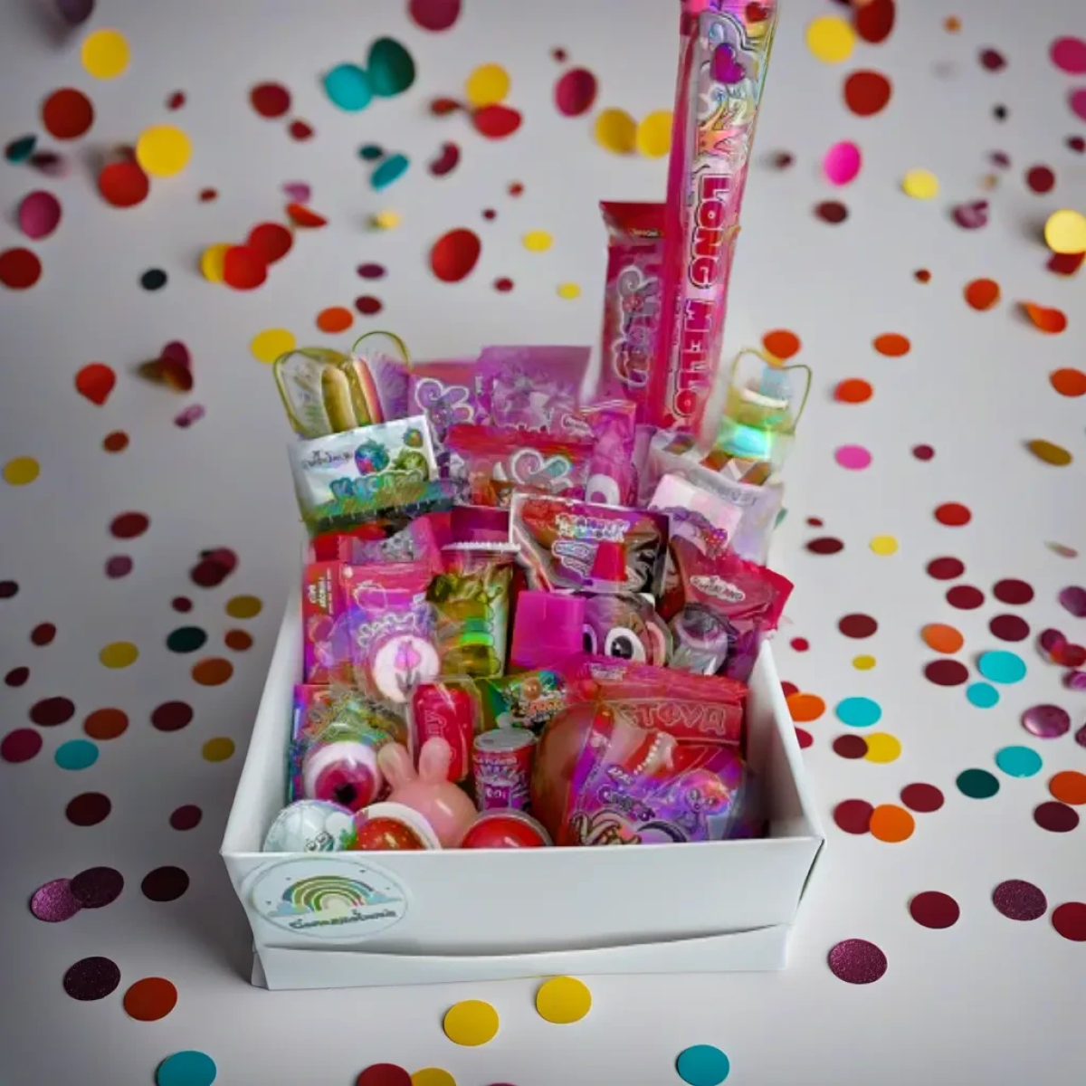 Цей подарунковий бокс – не тільки смачний сюрприз, а й справжній калейдоскоп веселки та радості. Він чудово підходить для свят, дитячих вечірок та особливих моментів, наповнених веселощами та посмішками.