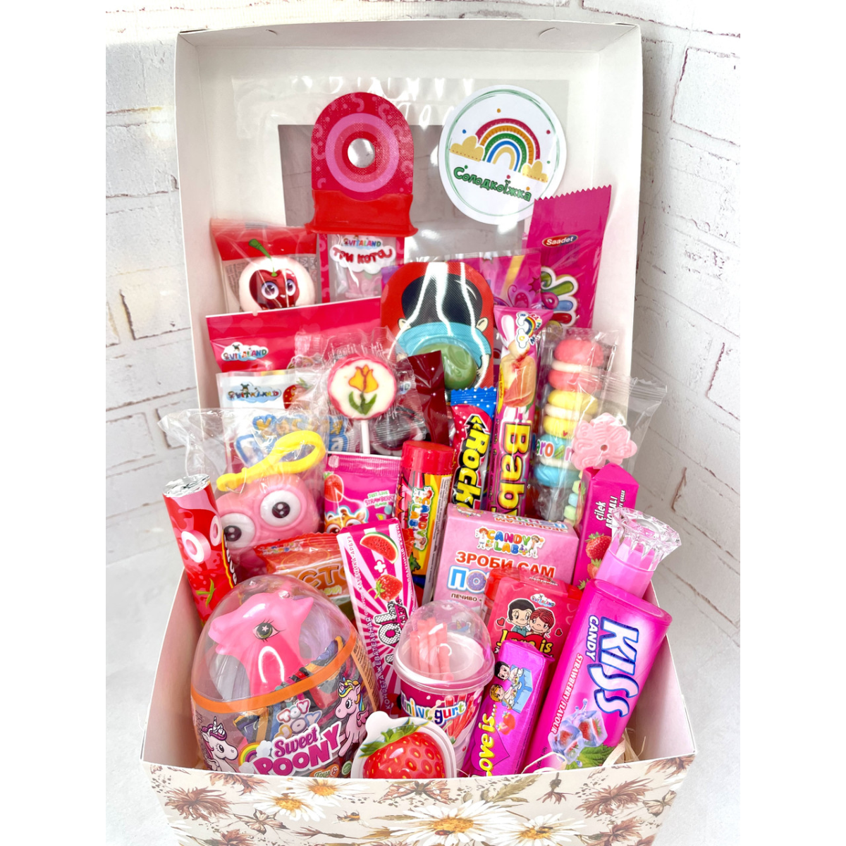 Цей подарунковий бокс – не тільки смачний сюрприз, а й справжній калейдоскоп веселки та радості. Він чудово підходить для свят, дитячих вечірок та особливих моментів, наповнених веселощами та посмішками.