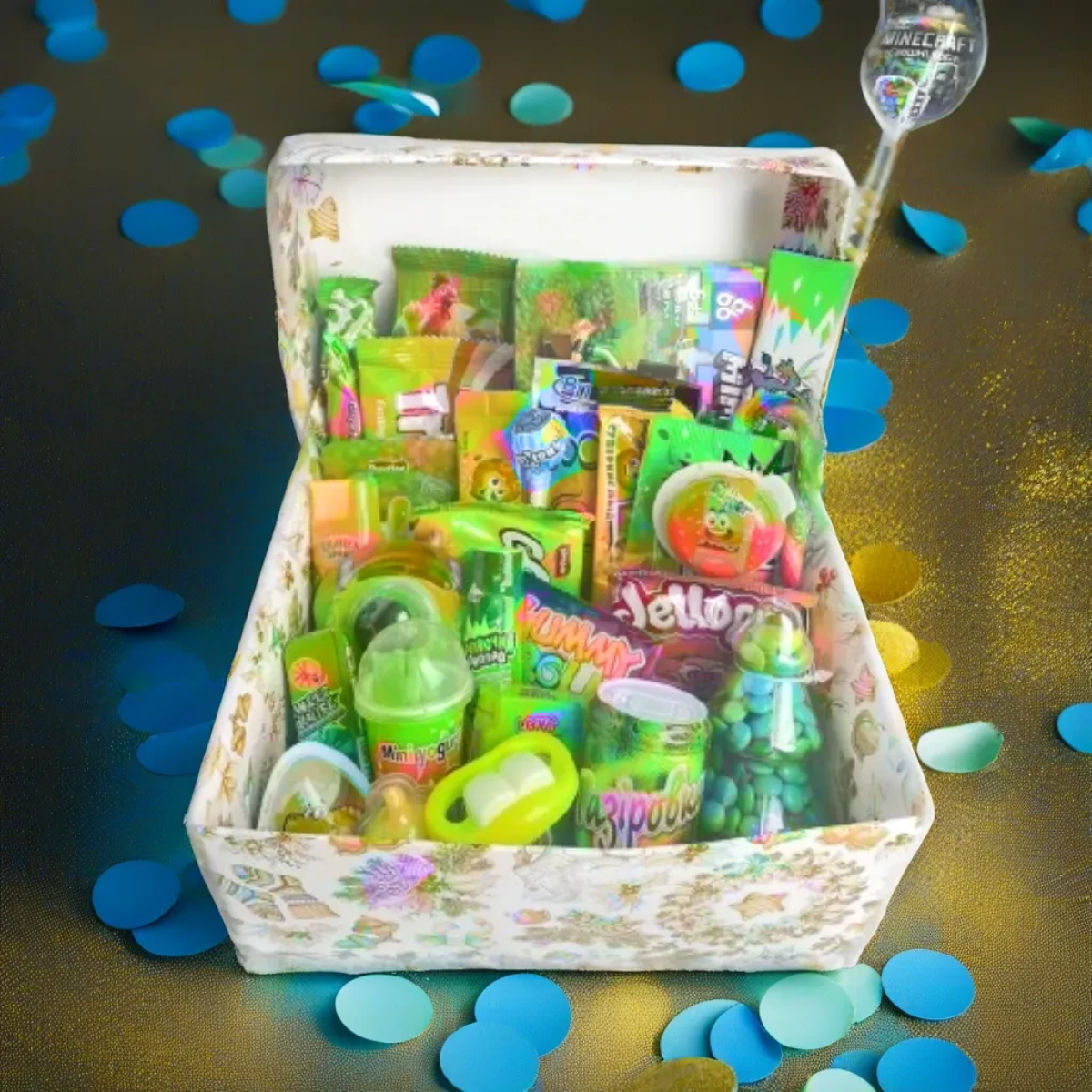- Яскраве Оформлення: Бокс оформлений у яскравих та грайливих кольорах, створюючи святковий настрій та візуальне захоплення.