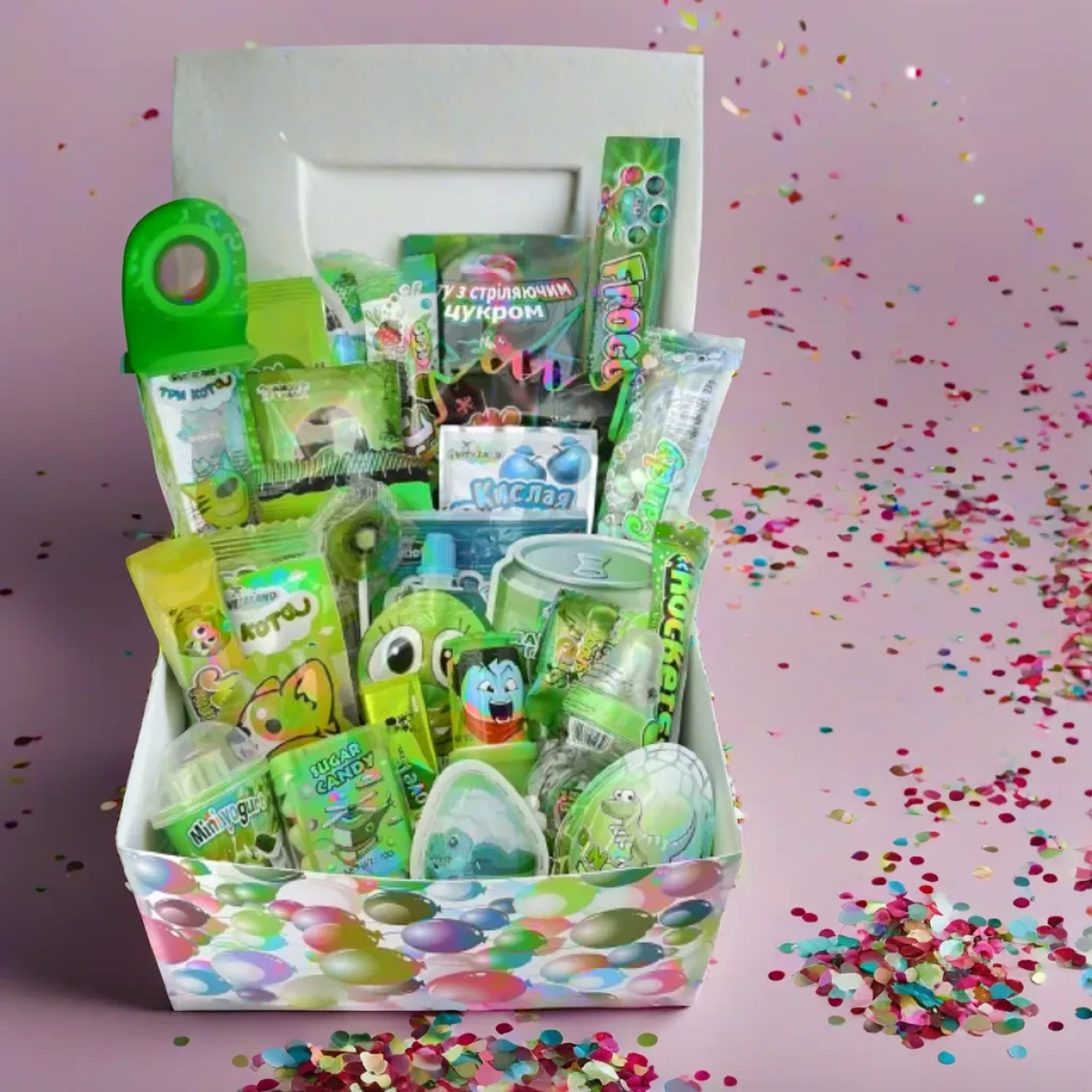 • Яскраве Оформлення: Бокс оформлений у яскравих та грайливих кольорах, створюючи святковий настрій та візуальне захоплення.