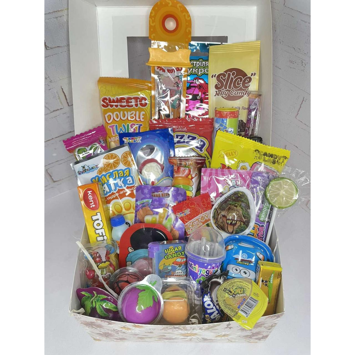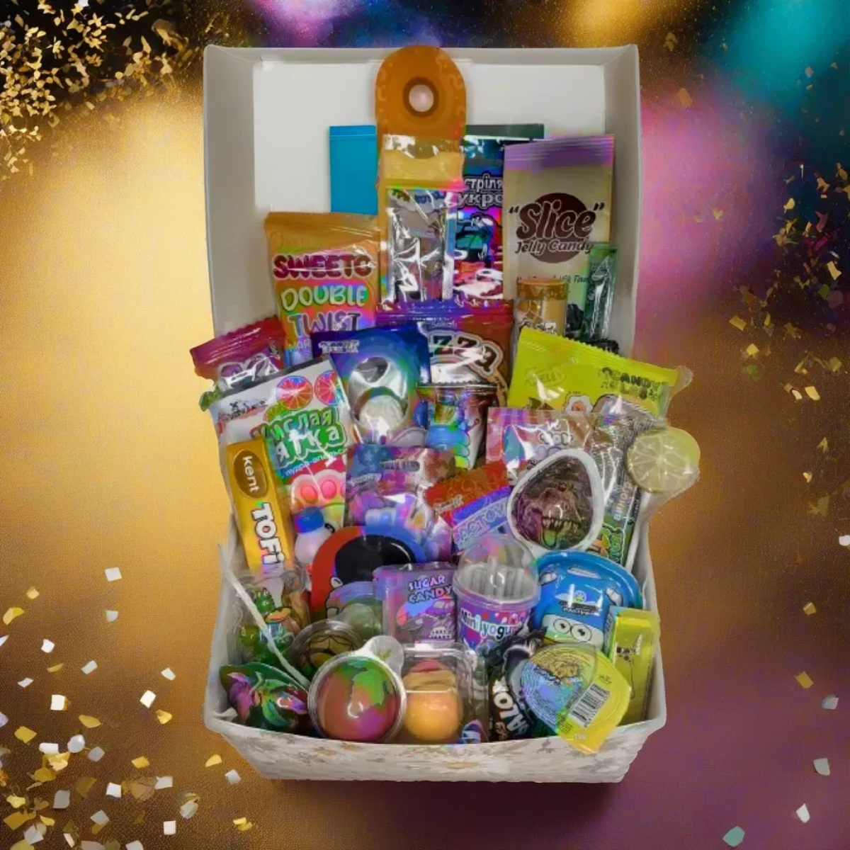 • Яскраве Оформлення: Бокс оформлений у яскравих та грайливих кольорах, створюючи святковий настрій та візуальне захоплення.