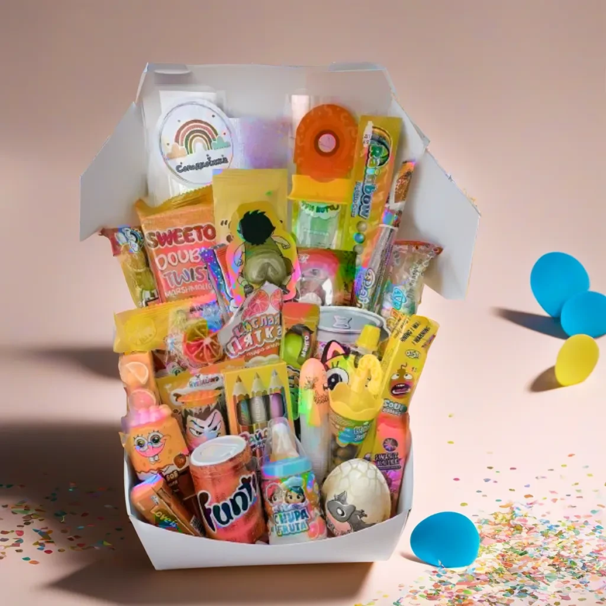 • Яскраве Оформлення: Бокс оформлений у яскравих та грайливих кольорах, створюючи святковий настрій та візуальне захоплення.