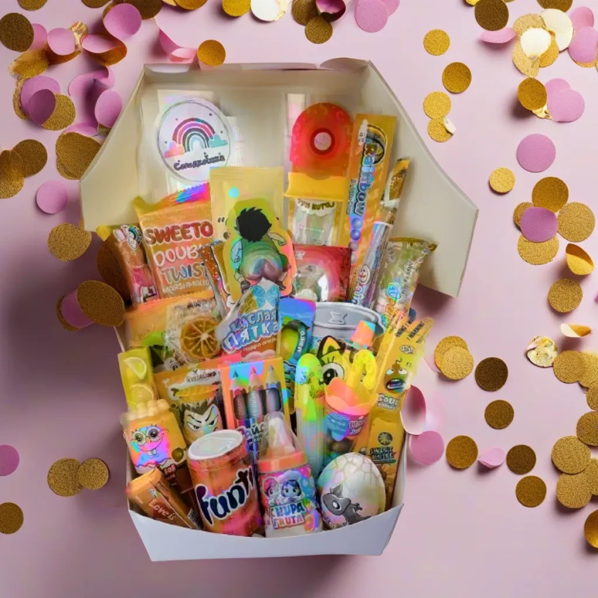 Цей подарунковий бокс – не тільки смачний сюрприз, а й справжній калейдоскоп веселки та радості. Він чудово підходить для свят, дитячих вечірок та особливих моментів, наповнених веселощами та посмішками.
