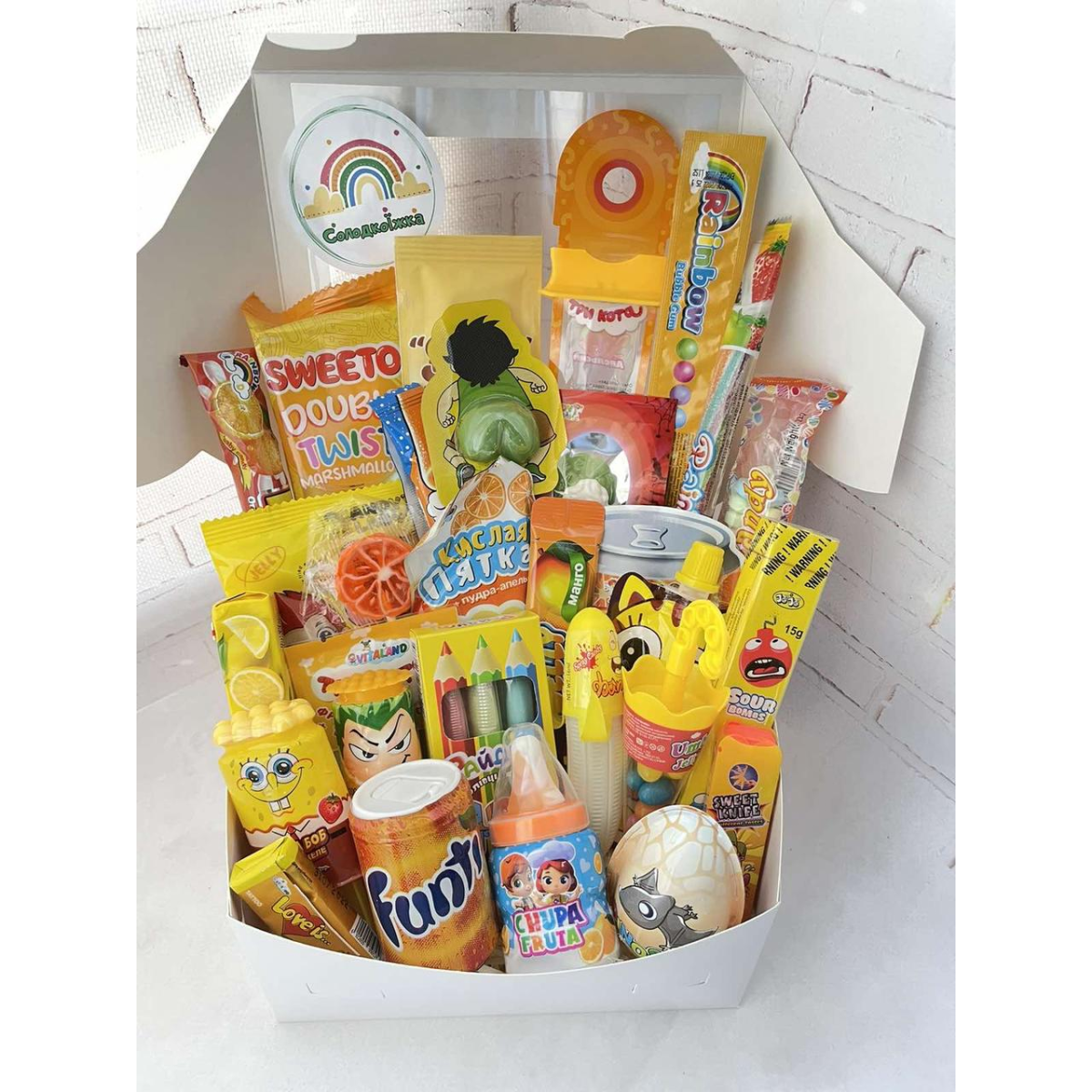 Цей подарунковий бокс – не тільки смачний сюрприз, а й справжній калейдоскоп веселки та радості. Він чудово підходить для свят, дитячих вечірок та особливих моментів, наповнених веселощами та посмішками.