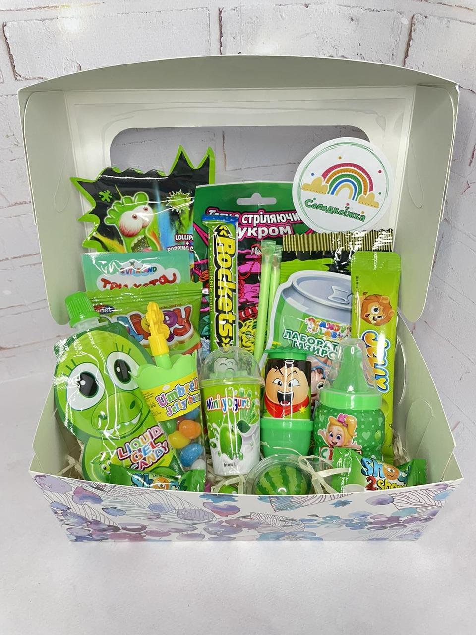 Цей подарунковий бокс – не тільки смачний сюрприз, а й справжній калейдоскоп веселки та радості. Він чудово підходить для свят, дитячих вечірок та особливих моментів, наповнених веселощами та посмішками.