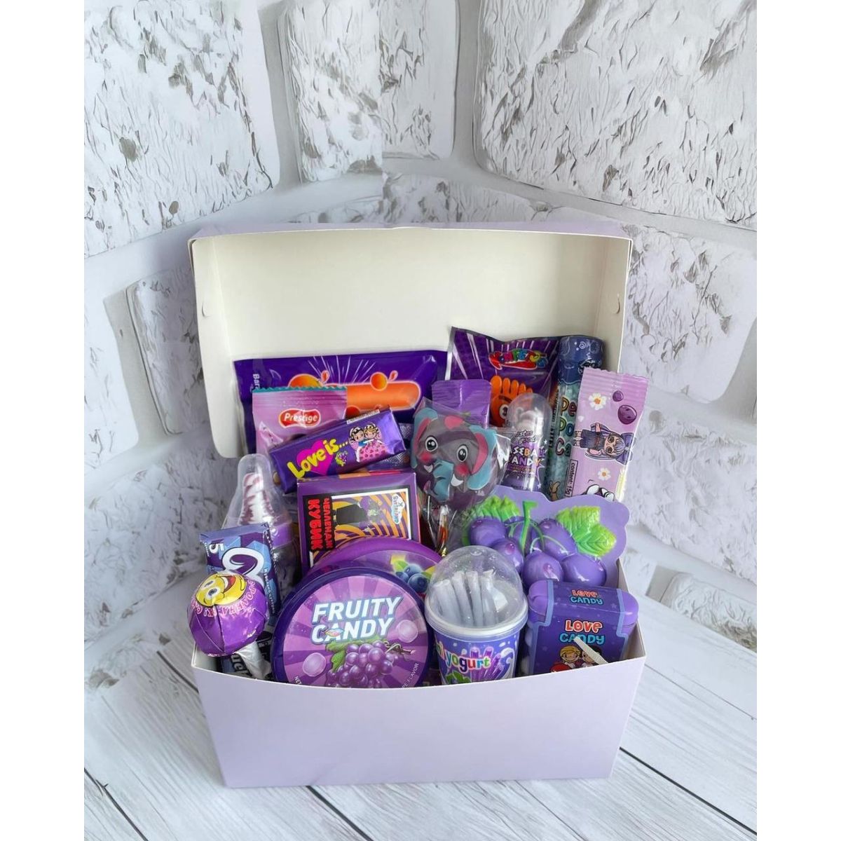 Барвистий подарунок дівчинці, бузковий бокс для ласуна, подарунок на дитяче свято