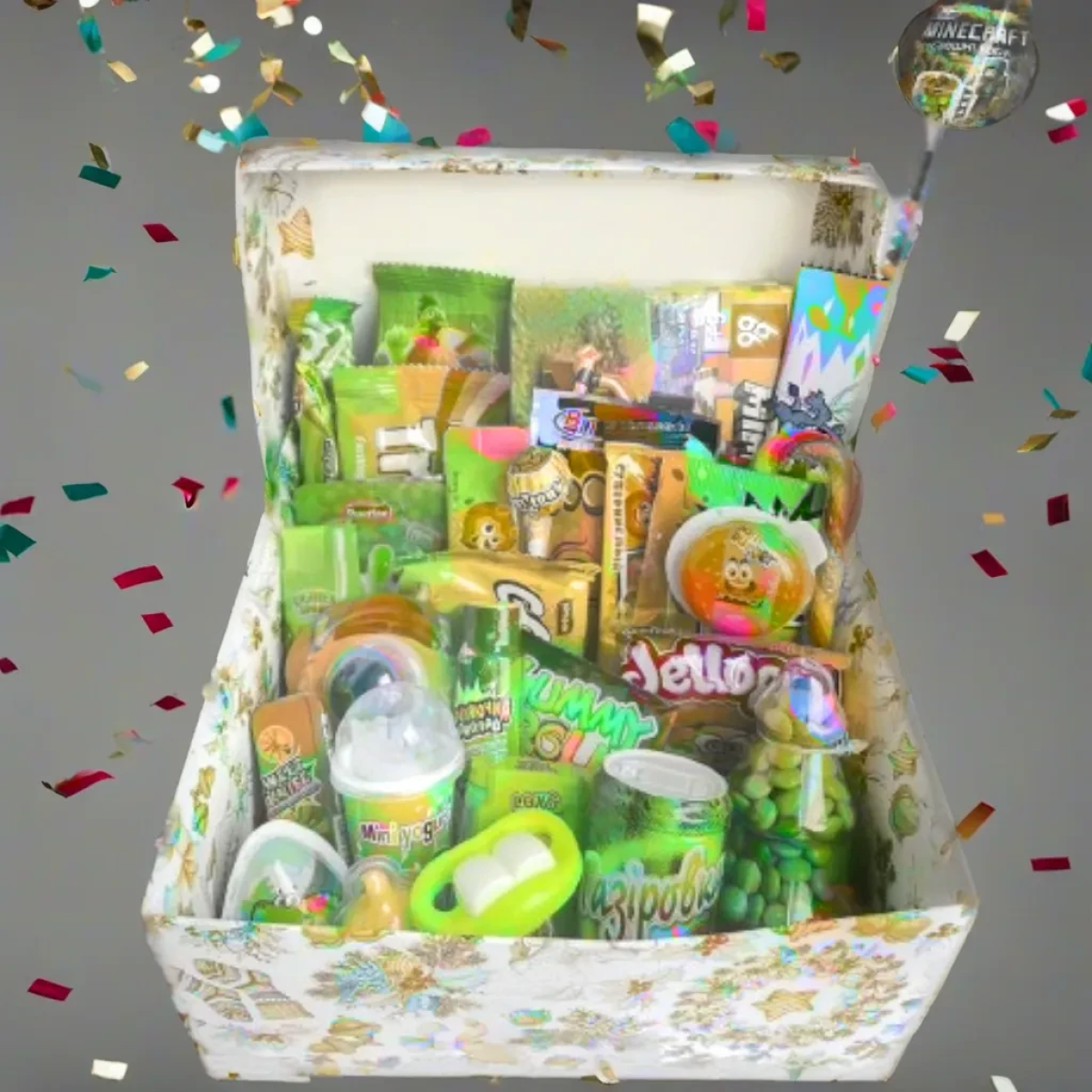 • Яскраве Оформлення: Бокс оформлений у яскравих та грайливих кольорах, створюючи святковий настрій та візуальне захоплення.