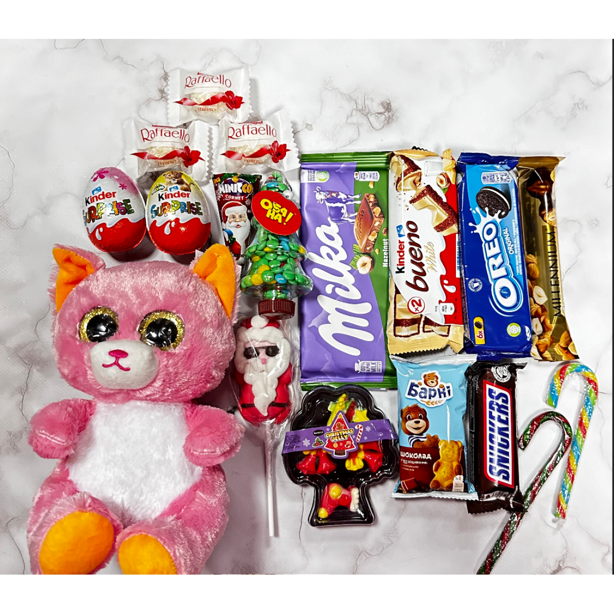 • Різноманітність Солодких Частування: Включає різноманітні солодкі частування, такі як цукерки, шоколадки, льодяники та інші смачні сюрпризи.