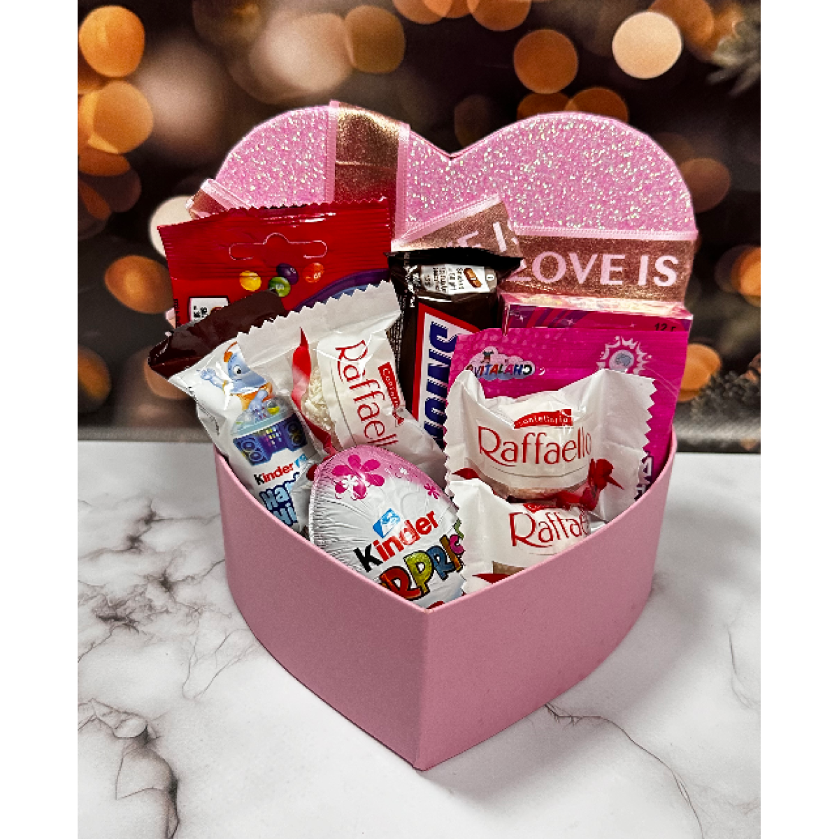 Солодкий набір цукерок красива подарункова коробка цукерок та шоколадок для коханої на 8 березня подарунок у формі серця